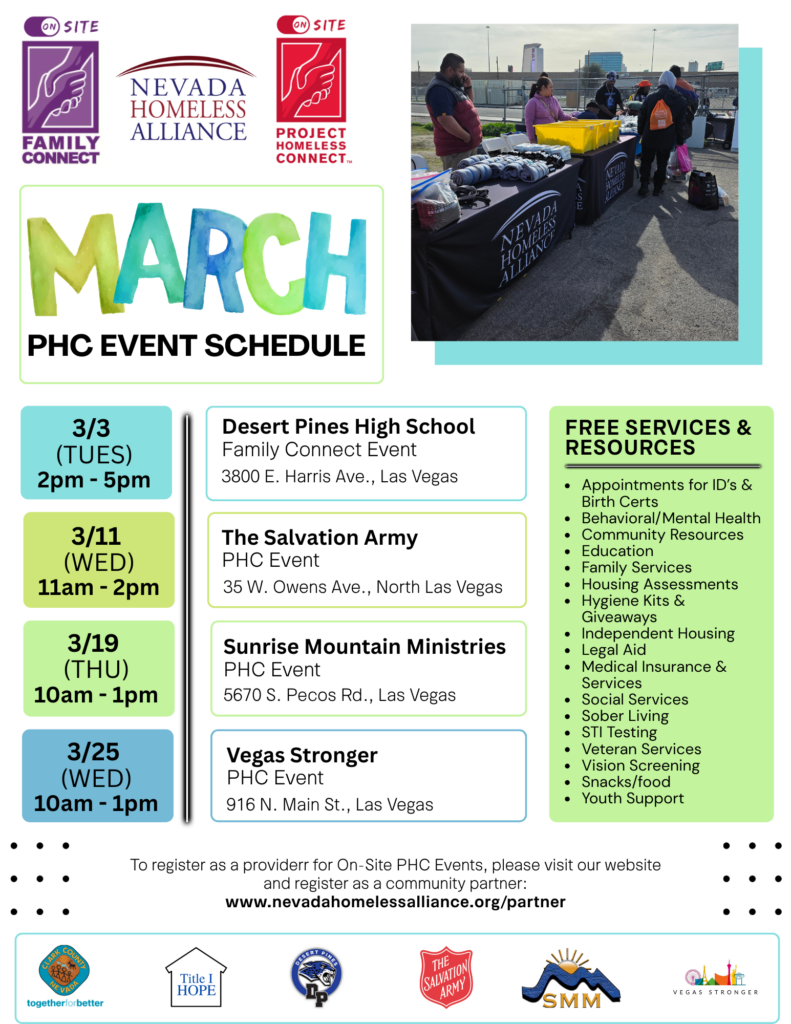 | March 3, 2026 | 9:00 AM – 1:00 PM | Project Homeless Connect Pop-Up | 711 N Tonopah Dr, Las Vegas, NV 89106 |